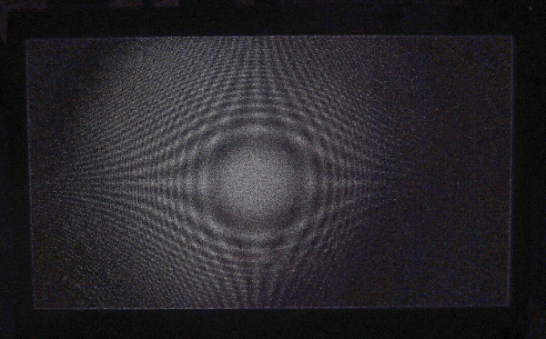 The lens effect macro structure is independent of the image contents. For example, the following picture of a computer monitor has a visible moiré pattern. The moiré pattern appears as a series of complex wave patterns in the white screen because the monitor's pixel elements do not perfectly align with the camera's sensor elements. (Don't see it? Look closely for fine vertical gray lines in the middle and a ringing pattern on the photo-right edge.)